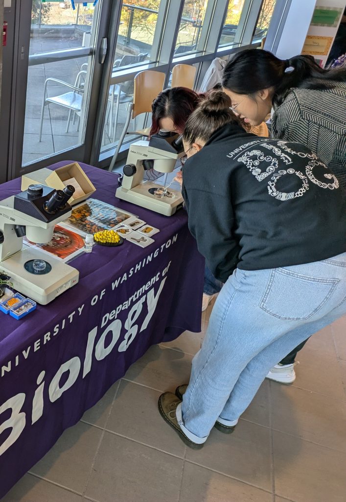 We partnered with Princess and Lydia from the Ahmed Lab to host a booth called “Think Like a Bug for the 2025 UW Brain Awareness Open House. The booth featured a demonstration of Drosophila courtship behavior, examples of insect brains, and an interactive activity where students guessed how bumblebees might respond to different flower scents. It was a fun way to share what we study and spark curiosity about insect behavior!